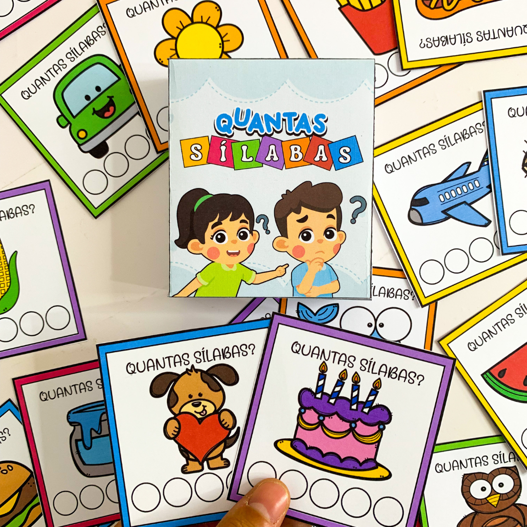 São 48 fichas coloridas, com imagens atrativas e bolinhas-guia, onde as crianças utilizam massinha, pompom ou tinta para marcar cada sílaba — estimulando a aprendizagem com movimento, criatividade e interação sensorial.